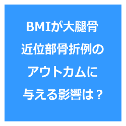 大腿骨近位部骨折 BMIが大腿骨近位部骨折例のアウトカムに与える影響は? 今回はBMIが大腿骨近位部骨折例のアウトカムに与える影響を考えるうえで参考になる論文をご紹介させていただきました. 今回の結果から考えると低BMIは術後アウトカムや死亡率の増加と関連する可能性がありますね. 2026.04.01 大腿骨近位部骨折
