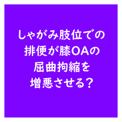 変形性膝関節症 しゃがみ肢位での排便が変形性膝関節症例の屈曲拘縮を増悪させる? 今回は変形性膝関節症例の屈曲拘縮を増悪させる要因を考えるうえで参考になる論文をご紹介させていただきました. 今回の結果から考えるとエレベーターのない高層住宅居住歴,膝外傷歴,排便時のしゃがみ姿勢が膝関節変形が変形性膝関節症例の屈曲拘縮の危険因子ということになりますね. 2025.09.30 変形性膝関節症