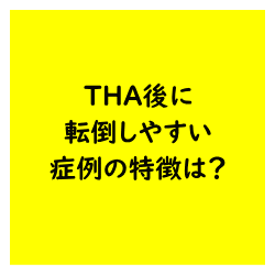 人工股関節全置換術 THA後に転倒しやすい症例の特徴は? 今回はTHA後に転倒しやすい症例の特徴を考えるうえで参考になる論文をご紹介させていただきました. 今回の結果から考えると転倒歴やうつ病,神経疾患,不眠症の有無,人工股関節再置換術,膝痛,腰部疾患,やせ,高齢が転倒リスクになりそうですね. 2025.09.25 人工股関節全置換術